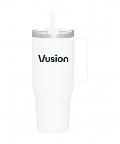 40 oz double wall 18/8 stainless steel thermal mug with copper vacuum insulation, stainless steel rim, dual-purpose push-on clear lid, matching sliding closure, flexible wide silicone straw, and powder coated finish. Individual gift box. Hand wash recommended. Do not microwave. Complies with FDA, Prop 65. 9.75" H x 4" W